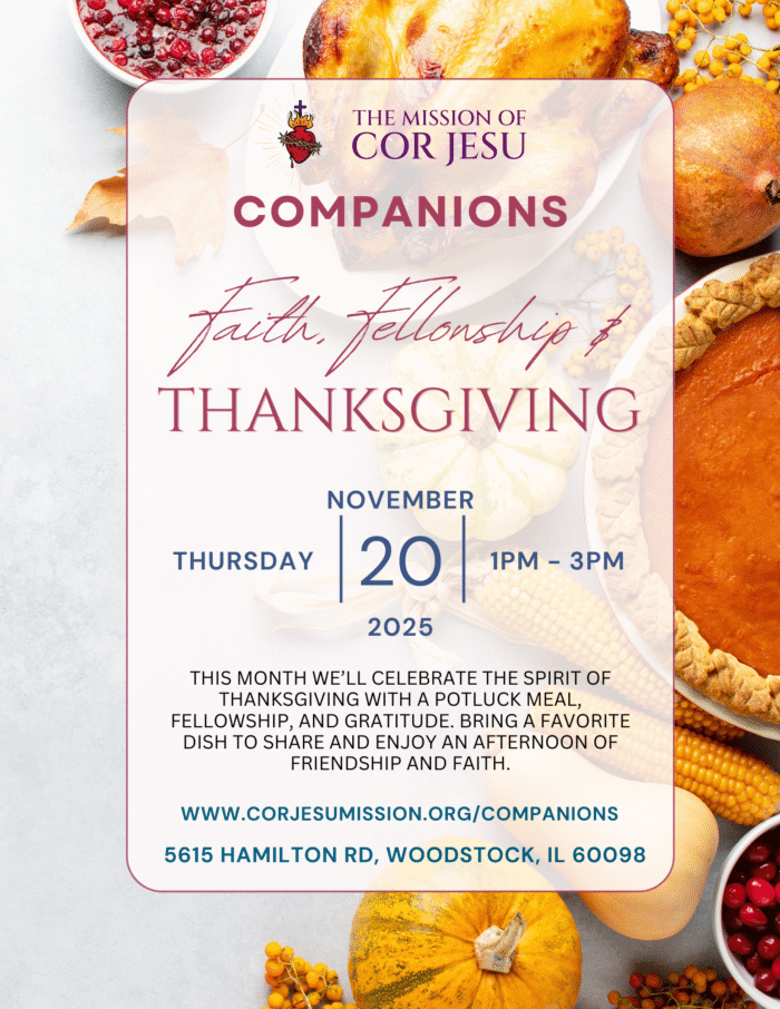 Celebrate the spirit of Thanksgiving with the Companions! Bring your favorite dish to share and enjoy an afternoon of gratitude, friendship, and faith-filled fellowship. Together weโll give thanks for Godโs blessings and strengthen our community in the Heart of Christ.